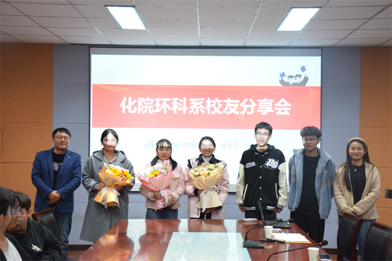 最后环科系在校生代表向四位学姐赠送鲜花表达谢意,并期待下一次与学姐们以及其他校友回校。