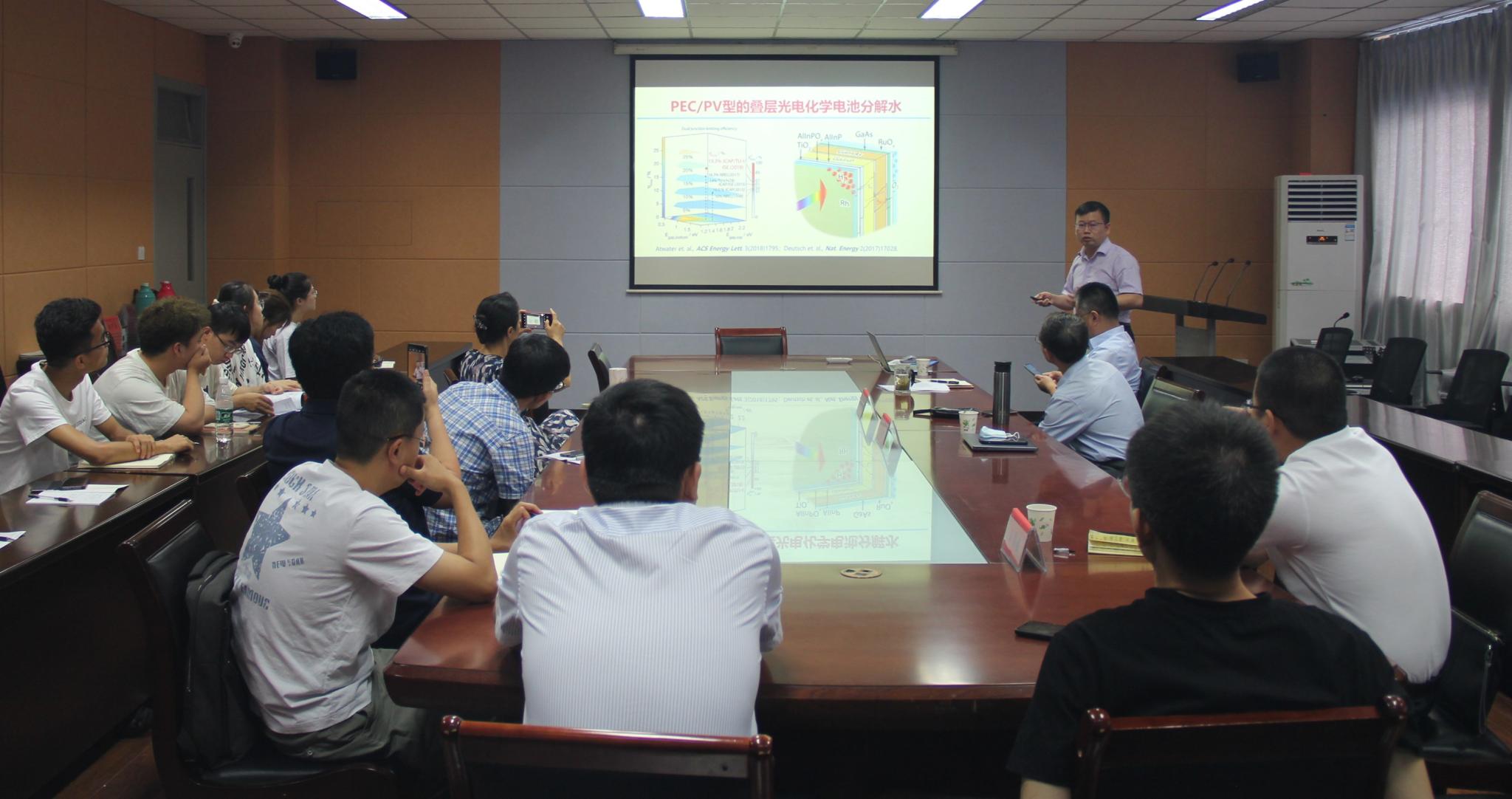李朝升教授从“新型光电极材料”、“亚稳相光电极材料”、“太阳能分解海水制氢”等方面与学院师生分享了本人课题组近期的研究成果,重点介绍了光电化学水分解产氢在太阳能转换为化学能源方面的优势及研究进展,其课题组近年来在新型、具有可见光响应的光阳极材料Ta3N5等方面的研究工作,并详细阐述了如何通过减少光生载流子的体相复合及表面复合来提高光电极材料的太阳能转换效率,强调构建清洁低碳安全高效的“绿氢”体系,是当前乃至今后一段时间的重大研究方向。李朝升教授在报告的过程中,思路清晰,思维严谨,既有做学术的严谨,又有为人师的激情。