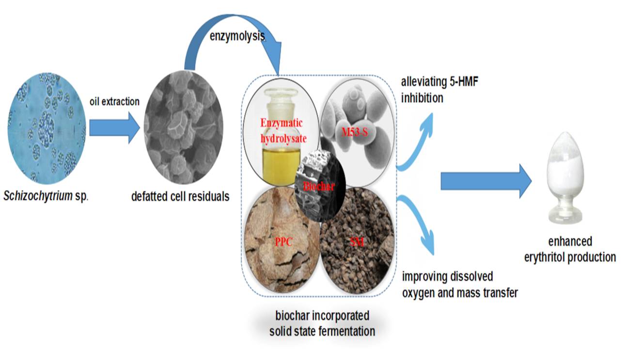 本研究以脱脂裂殖壶菌残渣为辅助原料进行赤藓醇高效发酵生产。微藻是一种重要的微生物油脂生产者,由于其细胞结构与真菌类似,油脂提取后的细胞残余物可作为微生物发酵的理想原料。为了有效发酵,必须考虑适当的酶解并降低毒性。本研究中,以脱脂裂殖酵母残渣酶解物(SRH)为原料,采用固态发酵生产赤藓醇,并通过在发酵基质中添加生物炭吸附此过程的有毒物质,从而缓解毒性抑制。固态发酵体系中添加4%生物炭和20%浓缩SRH后,分批发酵中赤藓糖醇产量达到190.5 mg/gds,补料发酵和重复批次发酵中赤藓糖醇产量则分别达到223.2和205.4 mg/gds。
