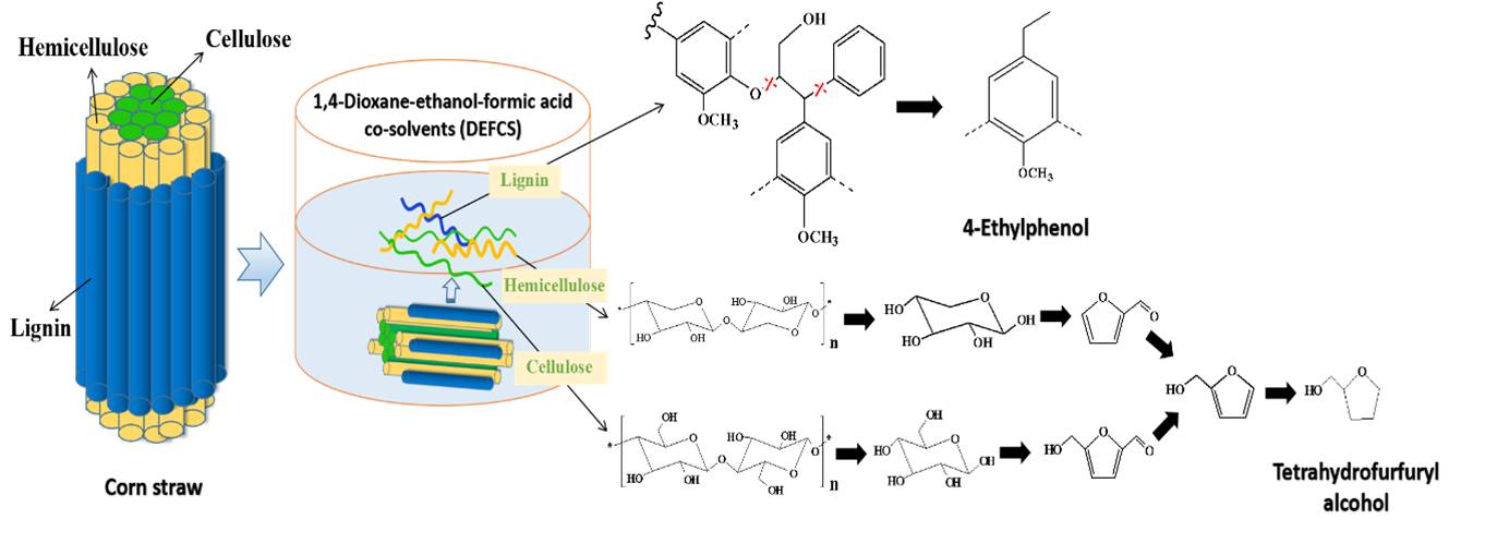 木质纤维素结构的复杂性和异质性致使其难以液化,针对目前木质纤维素液化过程中存在的原料转化率低和产物选择性差的问题,本研究基于溶剂化、原位氢化、烷基化以及酸催化能力考查,设计了一种具有强溶解性、催化活性及原位供氢能力的1,4-二氧六环-乙醇-甲酸复合溶剂(DEFC)。研究结果表明,DEFC复合溶剂可高效液化玉米秸秆、玉米芯、竹子、杨木等多种木质纤维素原料。利用该复合溶剂(25:25:9,v/v)液化玉米秸秆,残渣得率低至1.79%,液化生物油中乙酸乙酯可溶物(EASP)的四氢糠醇和4-乙基苯酚的含量高达29.33%和11.08%,表明该复合溶剂可实现木质纤维素原料的高效转化及定向液化。此外,DEFC复合溶剂还具有出色的重复使用性能。该研究对生物质原料的高效利用提供了重要参考。