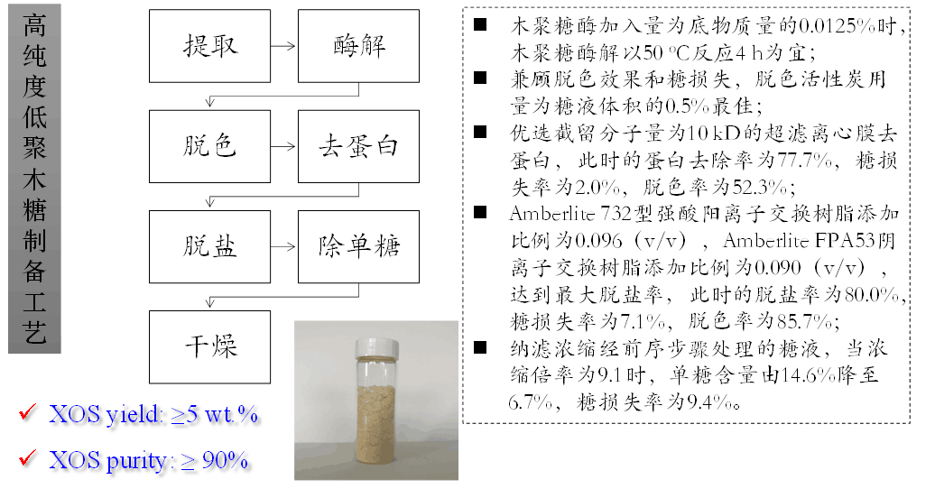 本研究通过探究水热自催化法、酸强化水热法和固体碱弱化水热法对半纤维素溶出影响,发现了酸强化法有利于高选择性溶出木聚糖;对木聚糖酶解条件以及脱色、脱蛋白、除盐和去单糖方法进行了探讨,建立了制备高纯度低聚木糖技术途径;提出了基于半纤维素预提取和固体碱活性氧蒸煮技术的竹材生物质组分分级分离及其利用的技术途径,实现了半纤维预提取联合固体碱制浆分离技术用于竹材三大素分离,提高了半纤维素组分利用效率。