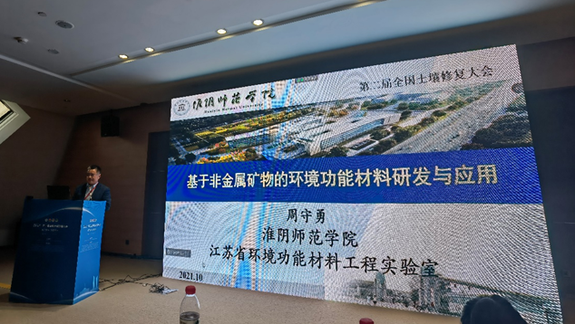 大会期间,77779193永利官网周守勇教授作了题为《基于非金属矿物的环境功能材料研发与应用》的报道,介绍了淮师先进膜材料与过程团队多年来在环境功能材料领域的研究进展及相关工作,展示了淮师科研团队在改善人居环境、治理生态污染、打造美丽生活等方面取得的新技术、新成果。