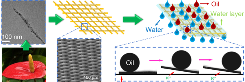 团队受红掌花表面特殊粗糙结构的启发,以一维凹凸棒石为载体,在其表面负载Fe3O4纳米颗粒,获得了类红掌花结构的复合材料(ARATP)。并通过浸渍涂覆及烧结工艺在金属丝网表面获得了稳定涂层。制备的网膜具有超亲水/水下超疏油的特性,网膜极易被水润湿,而与油滴的粘附效果极弱。该网膜在重力驱动下即可实现快速油水分离且过程零能耗。