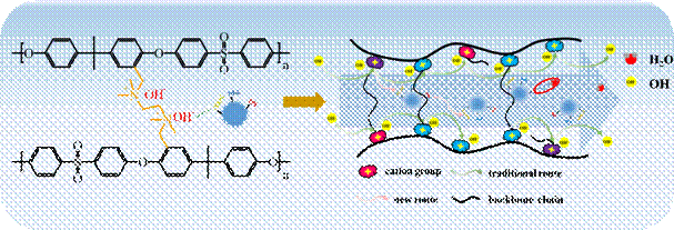 本文以聚醚砜为聚合物主链,通过碳量子点无机掺杂和交联改性共用的手段,制备出高性能的阴离子交换膜。碳量子点的填充,使阴离子膜的离子电导率和耐碱性能在交联改性的基础上得到进一步的提升。制备的阴离子交换膜在拥有高吸水率的同时,还具有良好的机械性能。这一研究,为阴离子膜性能提升提供了新思路。