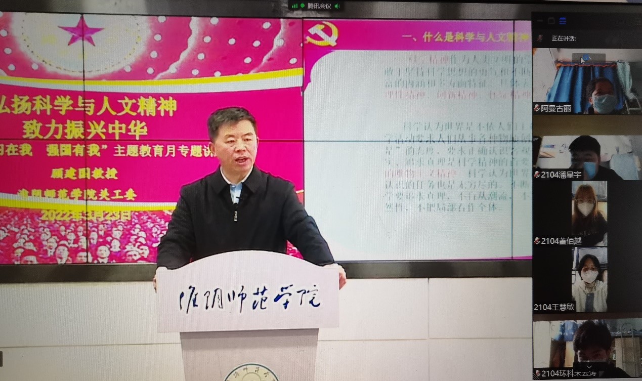 根据校主题教育月相关安排,我院于3月23日14:30组织学生观看“学习在我,强国有我”主题教育线上讲座。讲座由淮阴师范学院关工委常务副主任顾建国老师主讲。