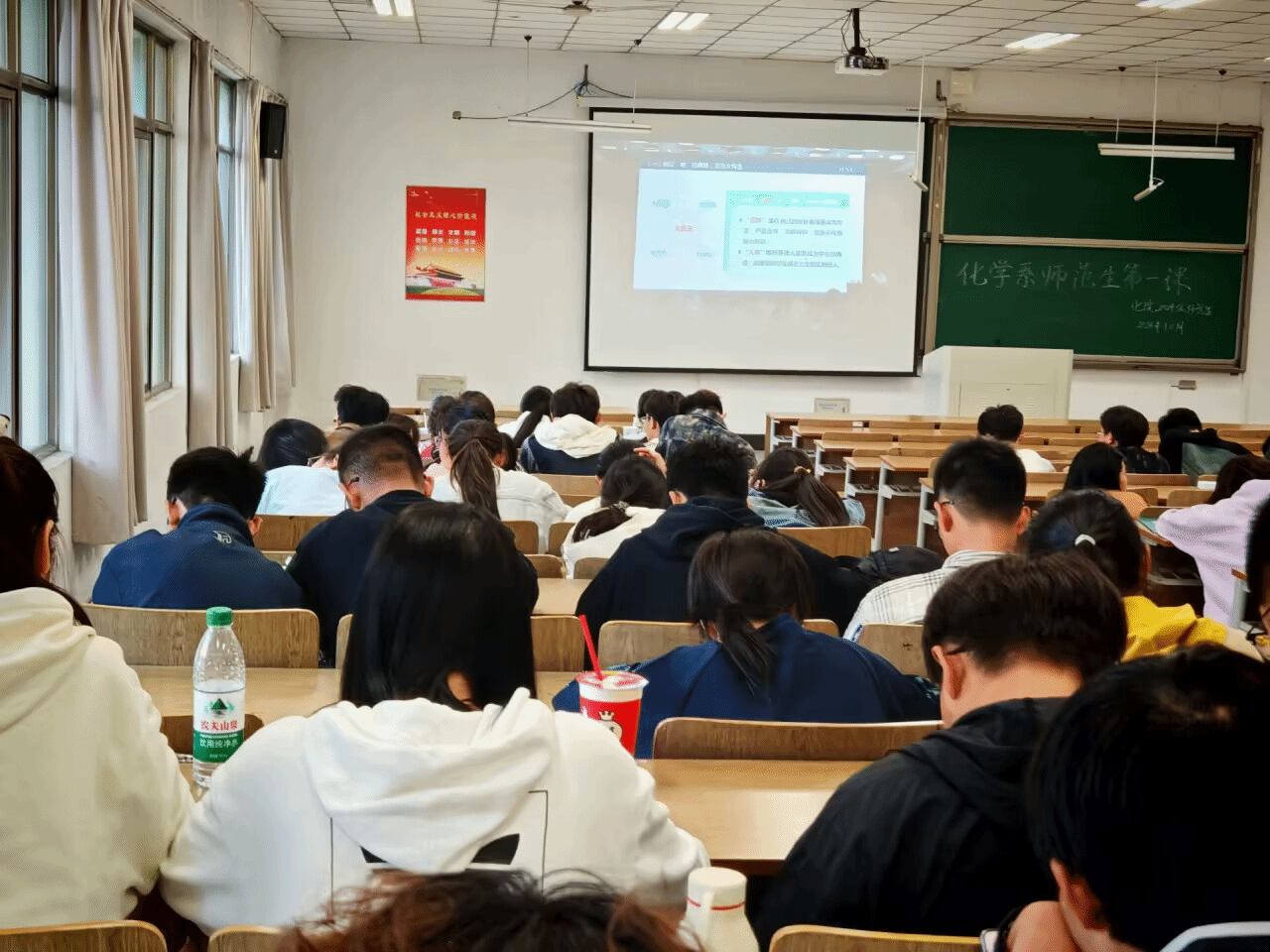 10月9日,淮阴师范学院举办了“师范生第一课”专题活动,赵宜江校长以“弘扬教育家精神 学为明日大先生”为题,为2024级师范生上了开学第一课。化学系组织2024级师范生在弘文阶102教室集中收看了现场直播。本次活动由化学师范技能社承办,社长濮嘉豪主持。