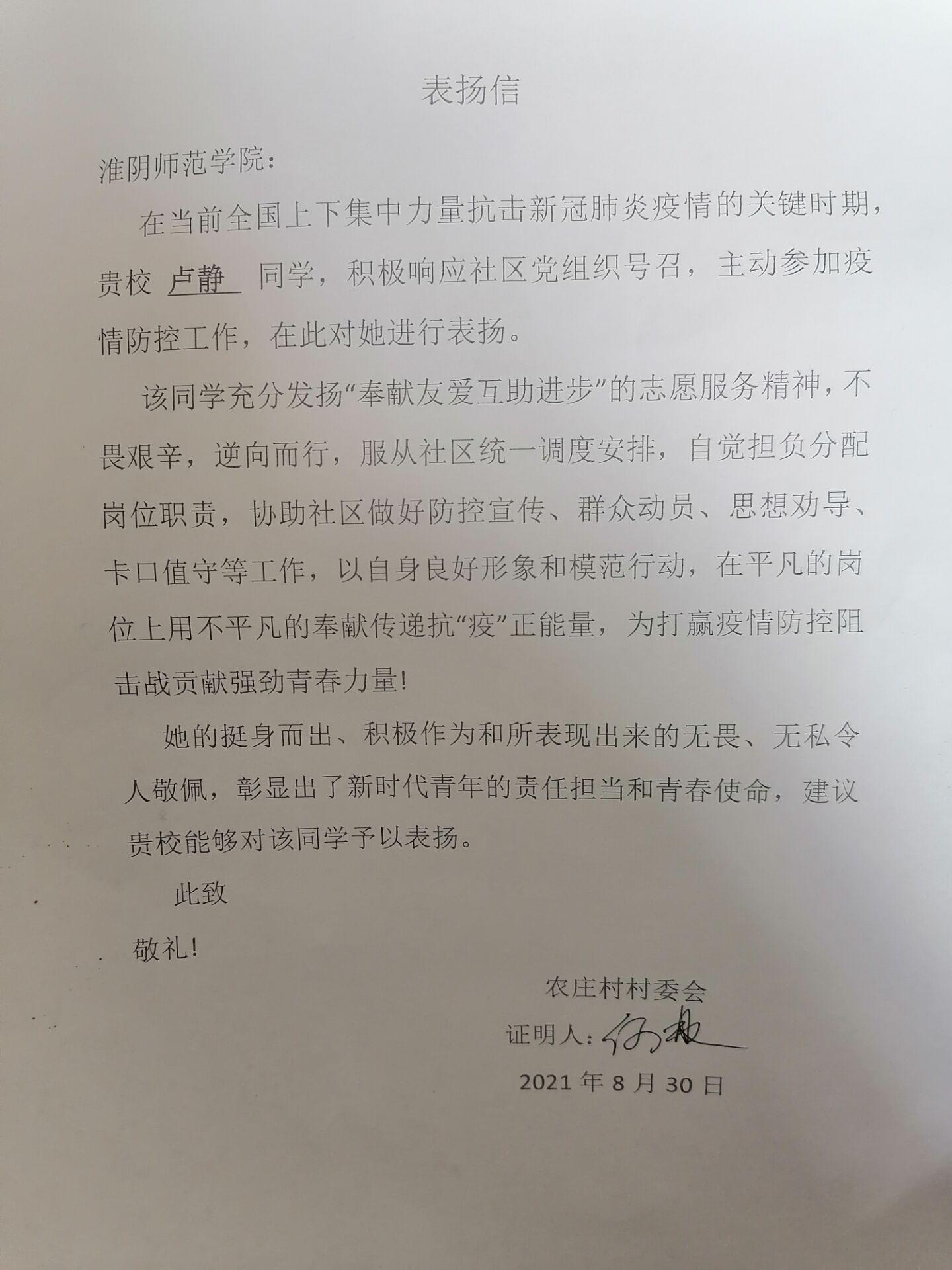 图为 滨江镇人民政府对2104陈静怡同学的表彰