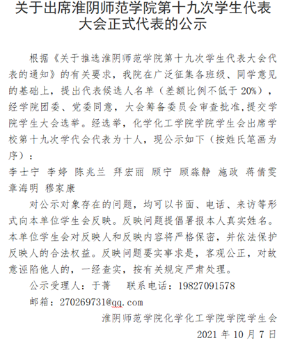 首先,由于菁老师向参会同学介绍淮阴师范学院第十九次学生代表大会候选人的基本情况。接着,参会同学对学生代表候选人的选择发表意见,进行选举。最终确定淮阴师范学院第十九次学生代表名单,名单公示如下: