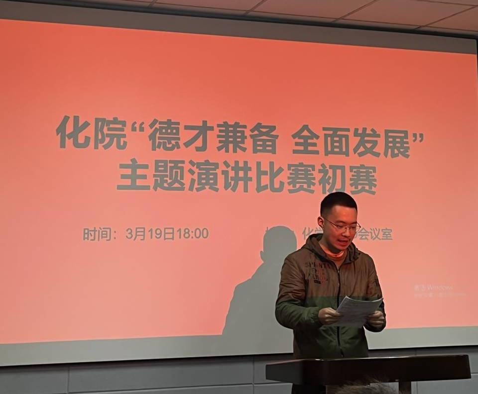 第一环节:主持人做演讲比赛开场白。化院信息宣传部部长闫硕同学就本次活动举办意义做出积极阐释,详细讲解了比赛要求、评分细则,并公布了此次活动评委。