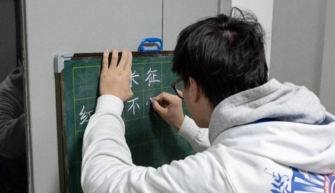 活动分为三个模块,首先,同学们来到化学楼书写粉笔字,统一从19点开始书写,练字是一个长期的练习,就像同学们书写的《长征》一样,学习红军精神,书写中国汉字。
