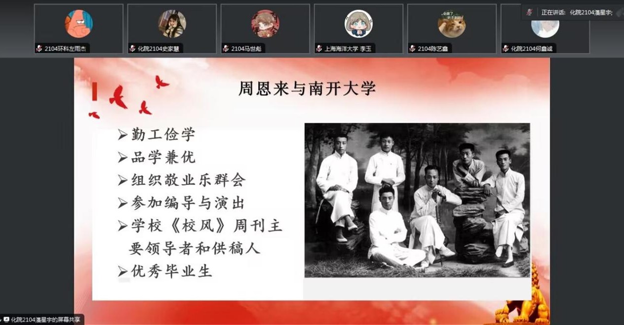 研讨会开始由化院2104班班长刘静宜介绍此次研讨会的目的与意义,接着上海海洋大学食品学院21级生物制药二班李玉及2104班潘星宇分享了周恩来同志在南开大学的求学经历,讲述了周恩来总理勤奋学习、为国家和人民奉献青春的故事,让在场的师生深受感动和启发。