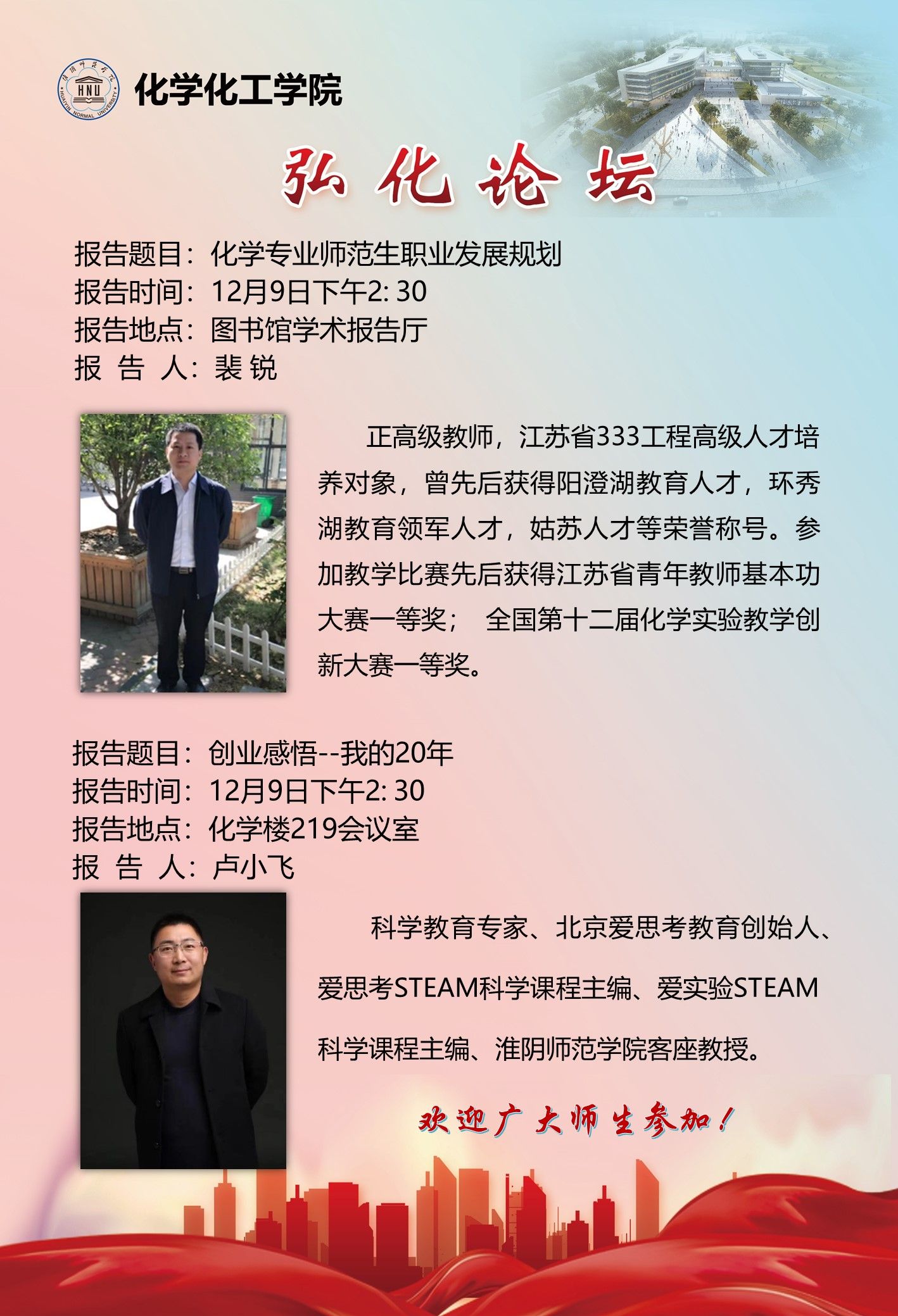 【弘化论坛】报告1:化学专业师范生职业发展规划;报告2:创业感悟--我的20年