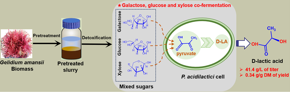 近日,淮阴师范学院生物质能团队在《Bioresource Technology》上发表题为“Third-generation D-lactic acid production using red macroalgae Gelidium amansii by co-fermentation of galactose, glucose and xylose”的论文,淮阴师范学院为第一完成单位。《Bioresource Technology》是生物质资源利用领域的国际知名期刊,最新影响因子为11.4,中科院一区。
