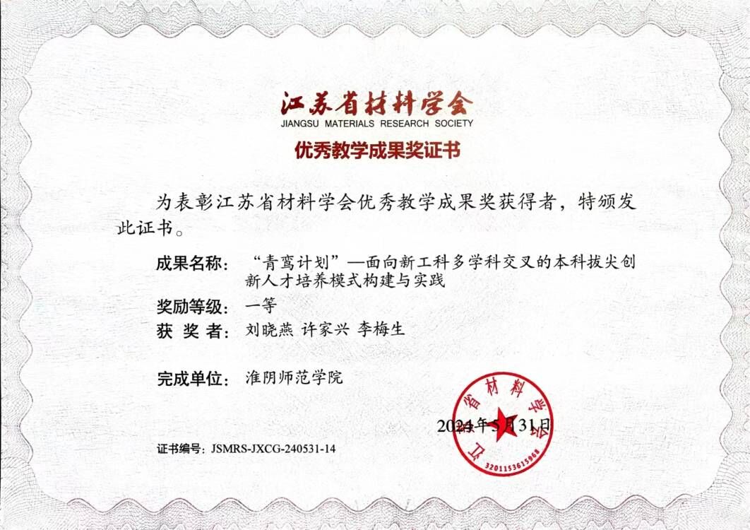 日前,首届江苏省材料学会“优秀教学成果奖”评审结果公布(苏材会〔2024〕11 号),77779193永利官网“青鸾计划-面向新工科多学科交叉的本科拔尖创新人才培养模式构建与实践”项目获优秀教学成果一等奖。