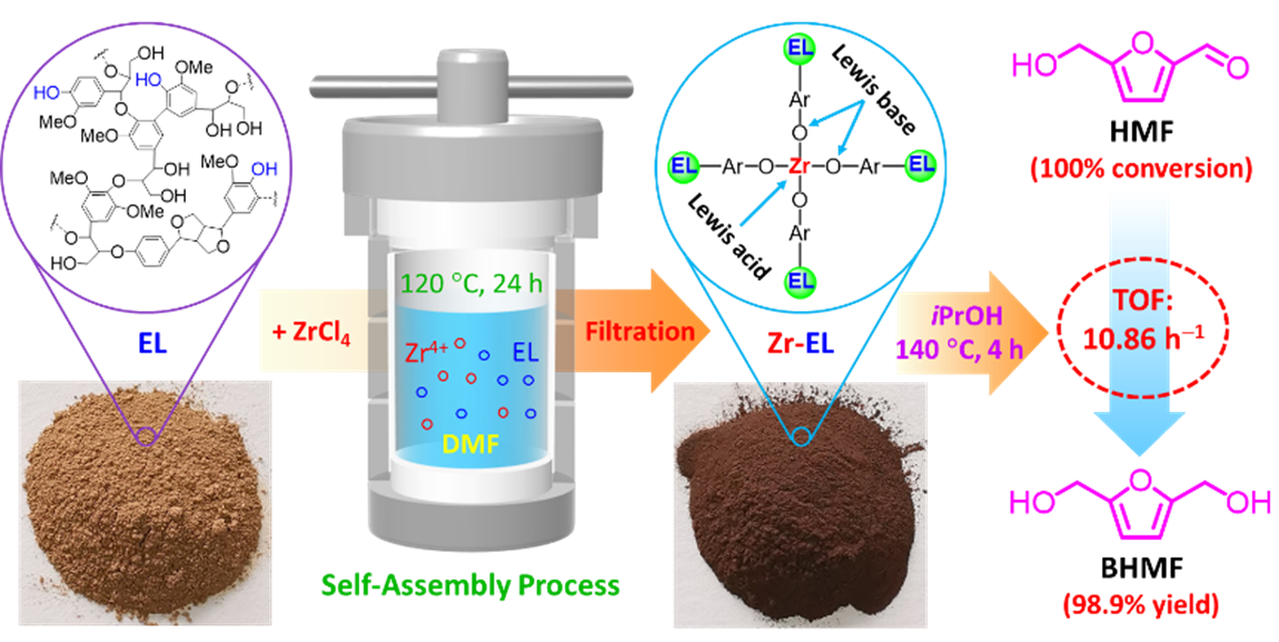 2,5-二羟甲基呋喃(BHMF)是一种新型的生物质基聚合材料单体,能够广泛应用于合成聚酯类、聚醚类和冠醚类等高分子材料。MPV转移加氢策略是将生物质基平台化合物5-羟甲基糠醛(HMF)选择性转化为BHMF的有效途径,其中,设计开发高效低成本的催化剂是关键。研究团队针对不同氢供体的供氢能力和空间位阻,利用溶剂热自组装法构筑了具有Zr4+-O2-酸碱对的木质素基双功能催化剂(Zr-EL)。催化剂表征和实验结果表明:Zr-EL展现出了优异的催化活性和催化选择性,而且还具有良好的循环稳定性和底物普适性。相关研究成果为新型高效催化剂的再设计与改进和转移加氢体系的再完善与应用提供了重要参考。