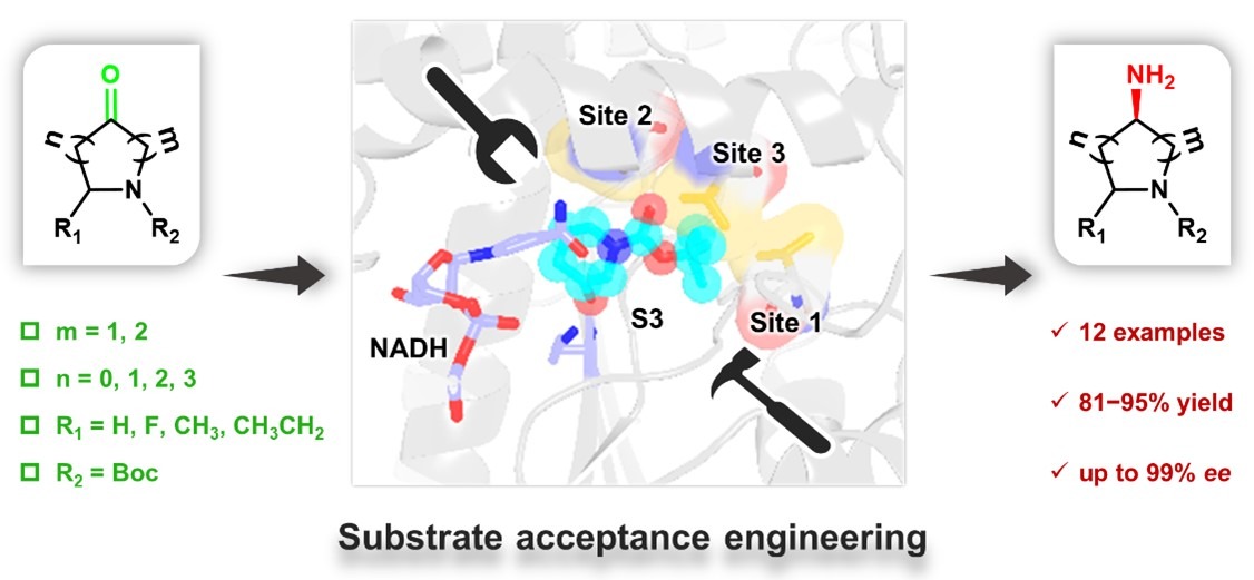 含氮结构基序,包括手性氨基和氮杂环是药物活性成分中的关键组分,同时含有这两种组分的手性氮杂环胺是众多重磅药物的构建砌块和合成中间体。因此,开发绿色高效的手性氮杂环胺合成途径是当前手性胺合成领域的主题之一。胺脱氢酶催化的潜手性羰基底物的不对称还原胺化反应具有以廉价无机氨为氨基供体、副产物仅为水等优点,符合当前强调的绿色制造理念和可持续性发展特征,在手性胺类化合物的生物合成中极具吸引力。然而,天然胺脱氢酶及其不对称催化体系的工业应用属性欠缺严重限制了其在手性氮杂环胺合成中的应用。