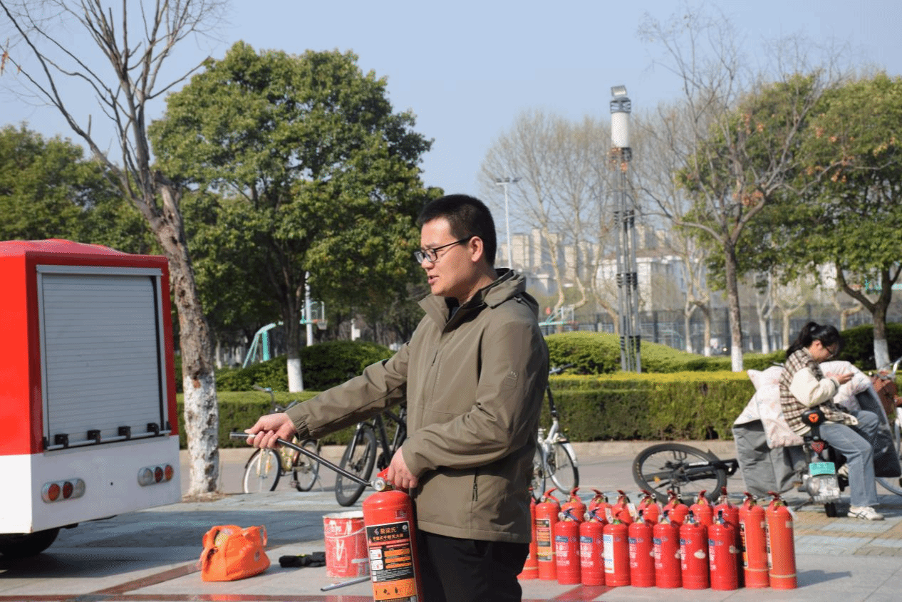 掌握技能,夯实安全根基。讲座结束后,王广慧老师带领40余名学生代表前往生化楼广场开展灭火器使用实操教学。教学现场,王广慧老师率先垂范,以标准且娴熟的动作演示了干粉灭火器的具体操作流程,从拔掉保险销,到握住喷管、按下压把,每一个步骤都精准到位、清晰明了。随后,在王老师的悉心指导下,学生们依次上前进行实际操作演练,亲身体验灭火器的使用方法,力求将所学技能内化于心、外化于行。