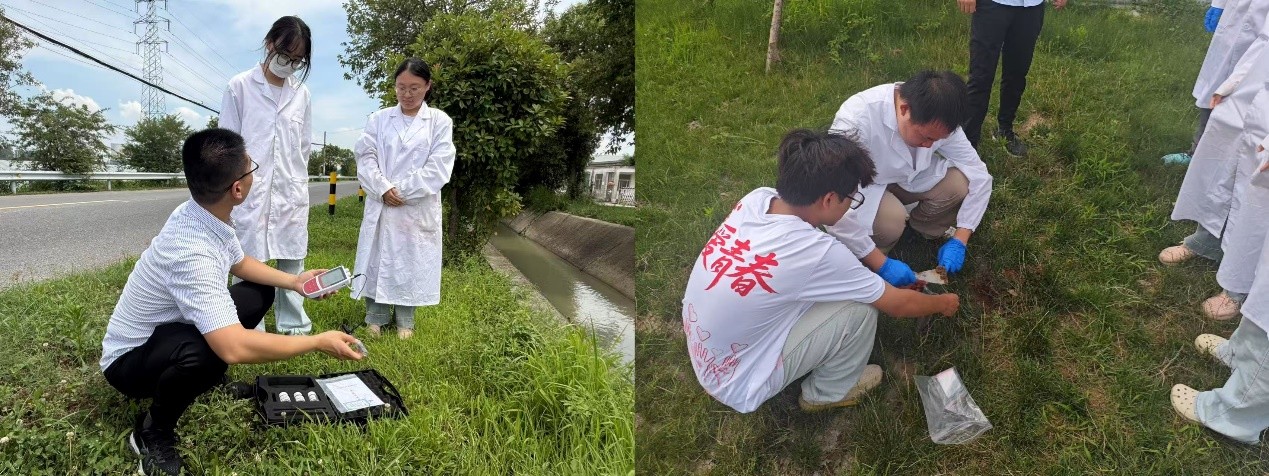 在乡村环境调研中,志愿队员走村入户开展垃圾分类问卷调查,精准摸清村民认知水平与实践现状;同步实施“河我一起·净土计划”,在学院专业老师的带领下,志愿者团队采用标准分析方法对采样点水质进行pH值测定,测得水质pH为7.70,并对采集的土壤样品进行预处理,使用无菌采样袋封装带回院实验室检测分析,为乡村环境治理提供数据支持。