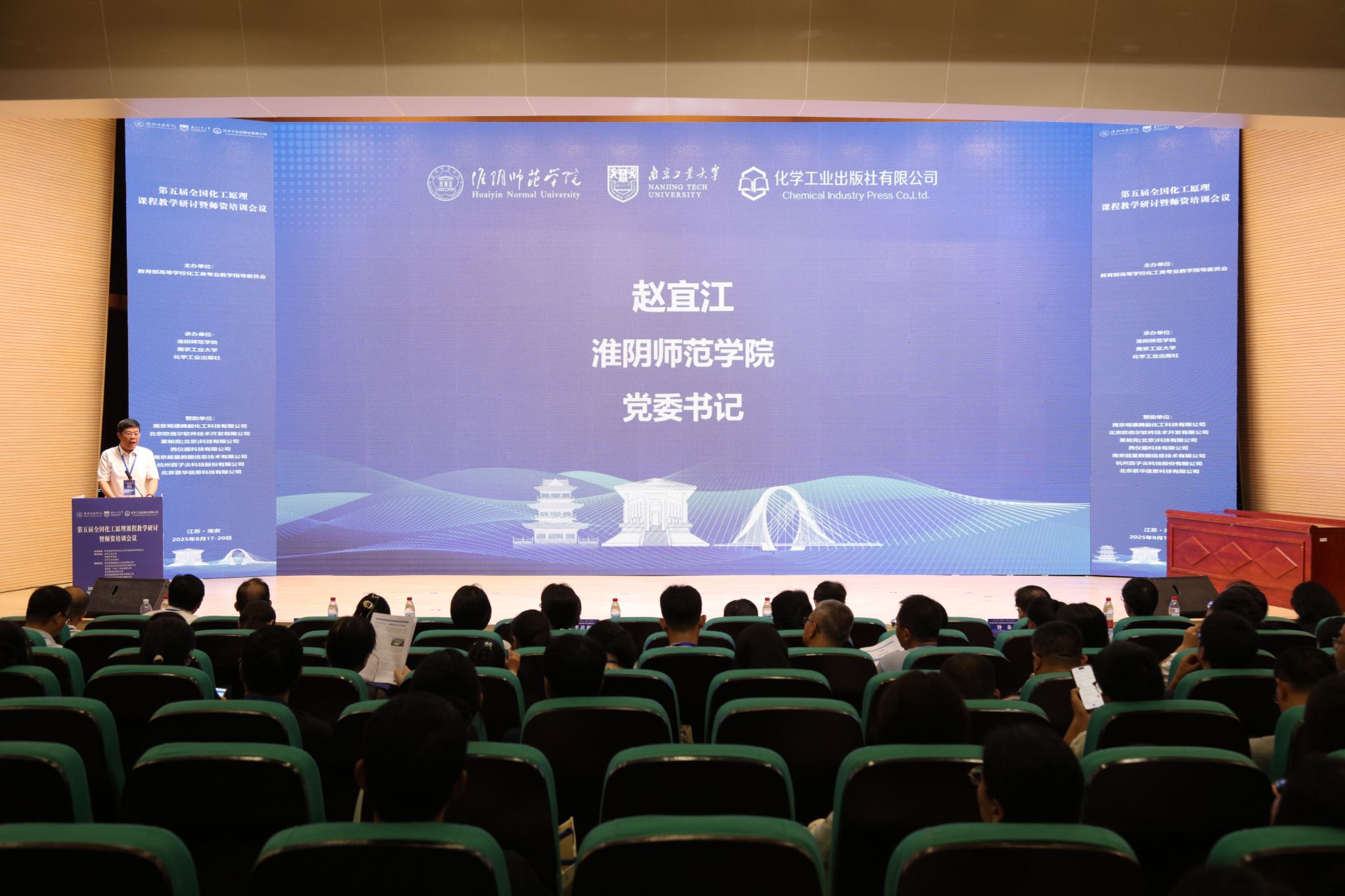 淮师新闻网8月21日电(记者 朱君)2025年8月17日-20日,由教育部高等学校化工类专业教学指导委员会主办,淮阴师范学院、南京工业大学、化学工业出版社联合承办的“第五届全国化工原理课程教学研讨暨师资培训会议”在淮师顺利召开。来自全国90余所高校的180余名化工原理教学骨干、教育领域专家及7家相关企业代表齐聚,围绕化工原理课程教学改革、AI技术赋能教育、科教产教融合等核心议题深入交流研讨。