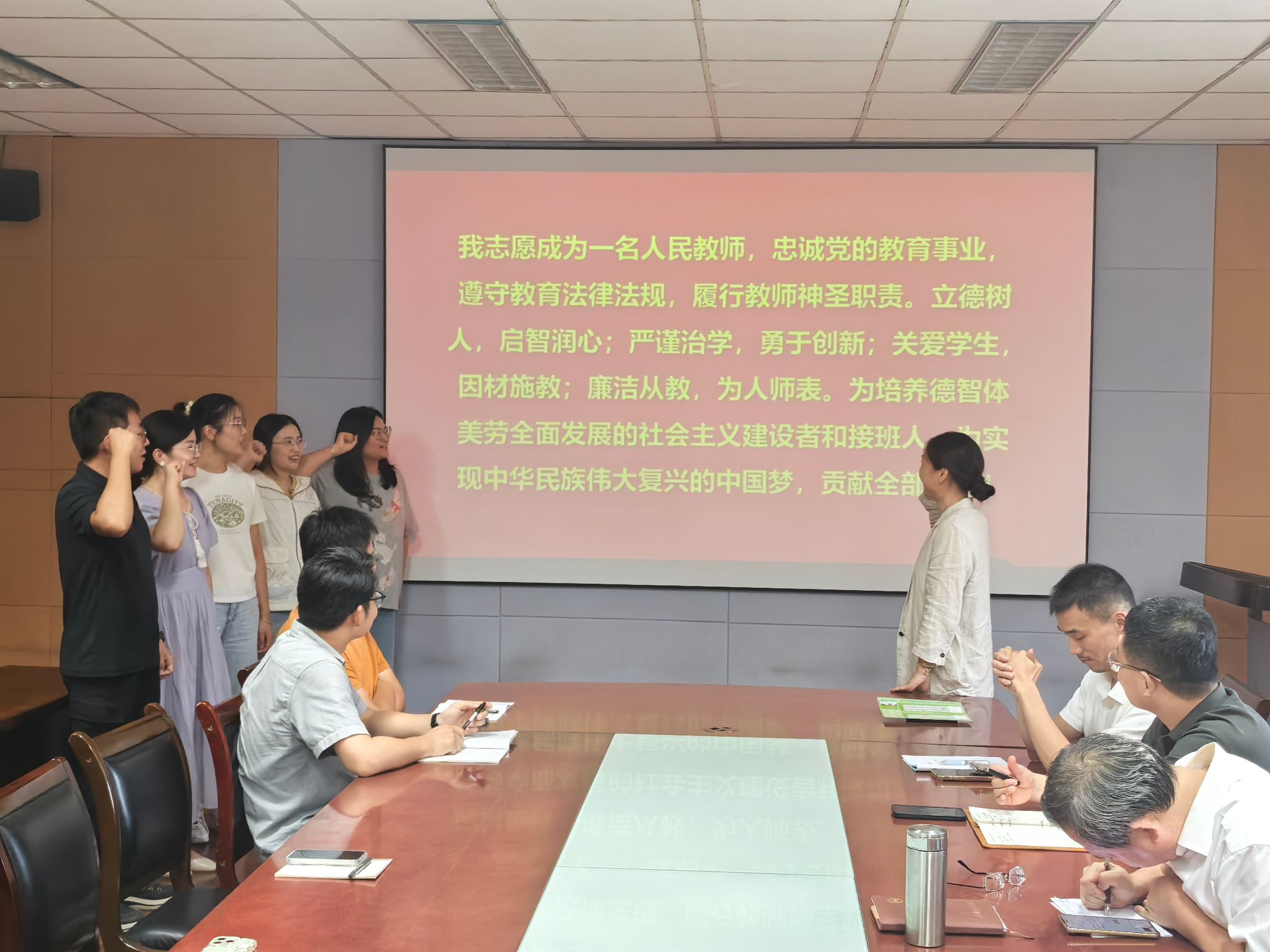 作为学院的传统,首先举行的是“青蓝结对”拜师仪式。为促进新教师尽快成长,发挥老教师 “传帮带”作用,根据学院情况,结合任教课程,征求新老师的意愿,学院为新进青年教师安排了指导老师。在教师节庆祝活动中,今年学院为5名青年教师安排了指导老师,并举行拜师仪式。新教师依次向指导教师献花,并表达教师节的祝福,随后集体起立,举起右拳,庄严宣读教师入职誓词,彰显对“人民教师”职业的敬畏与担当,开启教师生涯的成长历程。