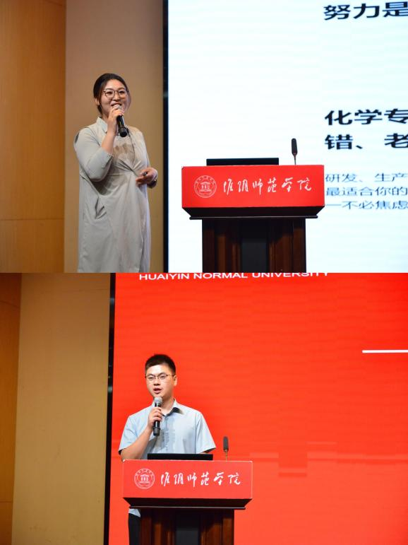 学院2006级校友,现淮安亿达化工有限公司安全总监万荣结合自身发展经历,向新生们分享了在化学化工领域从业的感悟,强调了大学期间专业知识学习与实践能力培养的重要性。学院2025届毕业生代表,现淮阴中学化学老师沈雅楠和东南大学研究生尹梦婷也分别从师范生发展和学术深造考研升学的角度,分享了在校学习期间的收获与成长,为新生们未来的发展提供了参考。