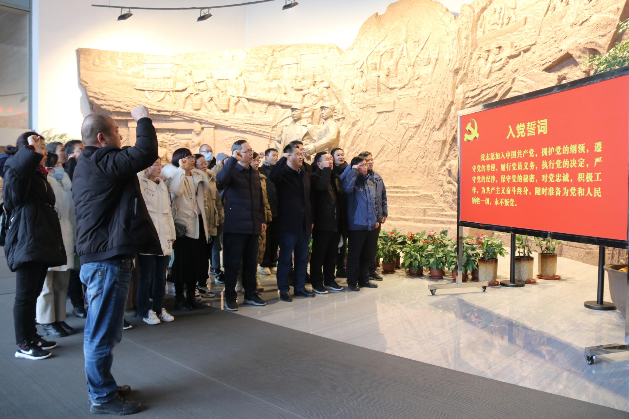 在纪念馆的党旗前,大家庄严宣誓,再次体验自己入党时面对党旗宣誓那神庄严的时刻。