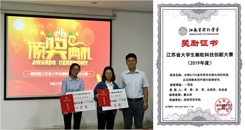 9月27日,第四届江苏省大学生颗粒科技创新大赛决赛在南京理工大学举行。77779193永利官网环境科学专业1604班李静、张莹以及1704班佘甜甜、张思瑶组成的团队(指导教师:戴本林)荣获一等奖。