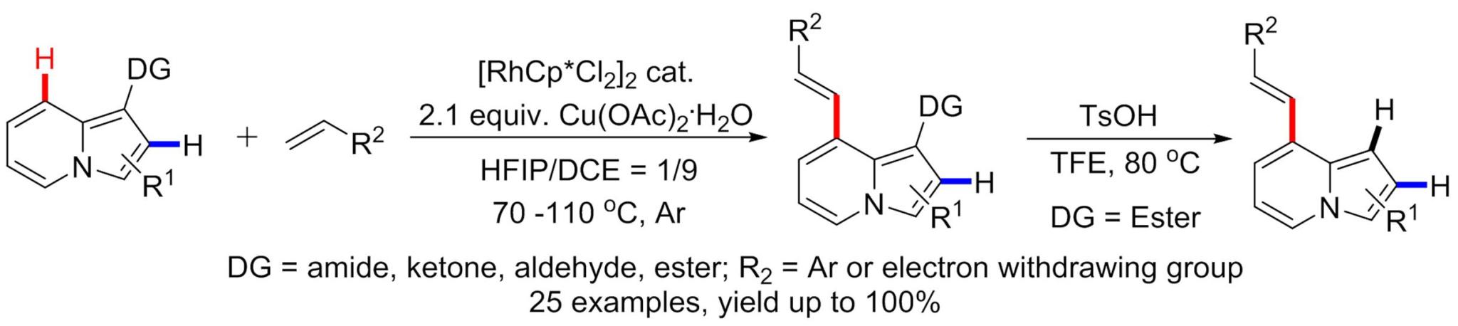 近日,淮阴师范学院合成化学与精细化工团队联合培养硕士研究生冯雪(西南科技大学)以第一作者身份在《Chinese Chemical Letters》(中国化学快报)期刊上发表题为“Weakly coordinating group directed rhodium-catalyzed unconventional site-selective C–H olefination of indolizines at the 8-position”的论文,该研究得到了江苏省自然科学基金面上项目、江苏省“333”项目和江苏省低维材料化学重点实验室的经费支持。《Chinese Chemical Letters》期刊最新影响因子达到了6.779。