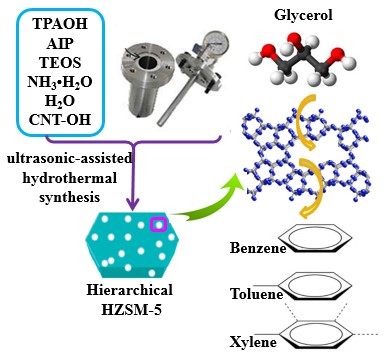 本论文研究了硬模板剂碳纳米管(CNT)含量、超声处理以及铝硅酸盐前驱体与CNT模板剂之间的相容性对多级孔HZSM-5选择性催化甘油芳构化性能的影响。课题组研究发现在多级孔HZSM-5合成过程中,适宜的模板剂添加量、改性的模板剂与前驱体相容性以及超声协同晶化,可以引入大量与HZSM-5相连通的介孔,从而为HZSM-5催化剂提供更多易接触的催化活性位点,同时提高了大分子在孔道中的扩散速率,与微孔HZSM-5相比,该硬模板剂法得到的多级HZSM-5在催化甘油芳构化时,其BTX芳烃选择性提高约2倍,催化寿命延长约2.5倍。