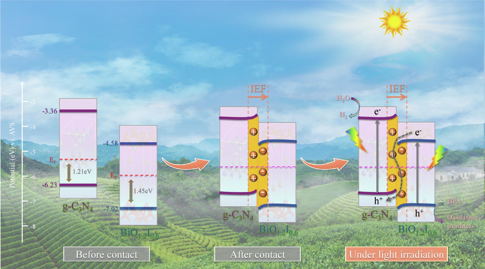 通过煅烧g-C3N4纳米片和花状BiOI的混合物,构建了g-C3N4/BiO1.2I0.6及Au/g-C3N4/BiO1.2I0.6异质结光催化剂。在可见光照射下,g-C3N4/BiO1.2I0.6和Au/g-C3N4/BiO1.2I0.6异质结表现出优异的光催化活性,并且具有高循环稳定性。电荷分离效率高、Au沉积引起的局部表面等离子体共振(LSPR)的优异光吸收以及S型异质结的是其具有高光催化活性原因。