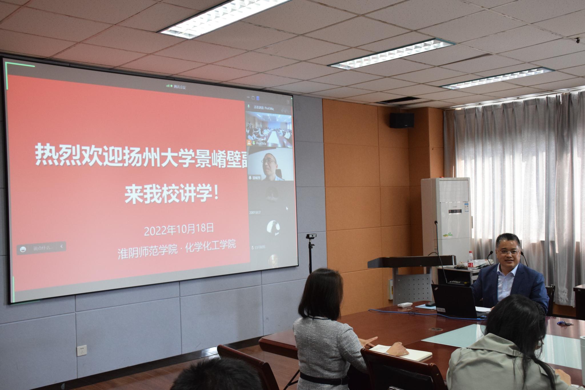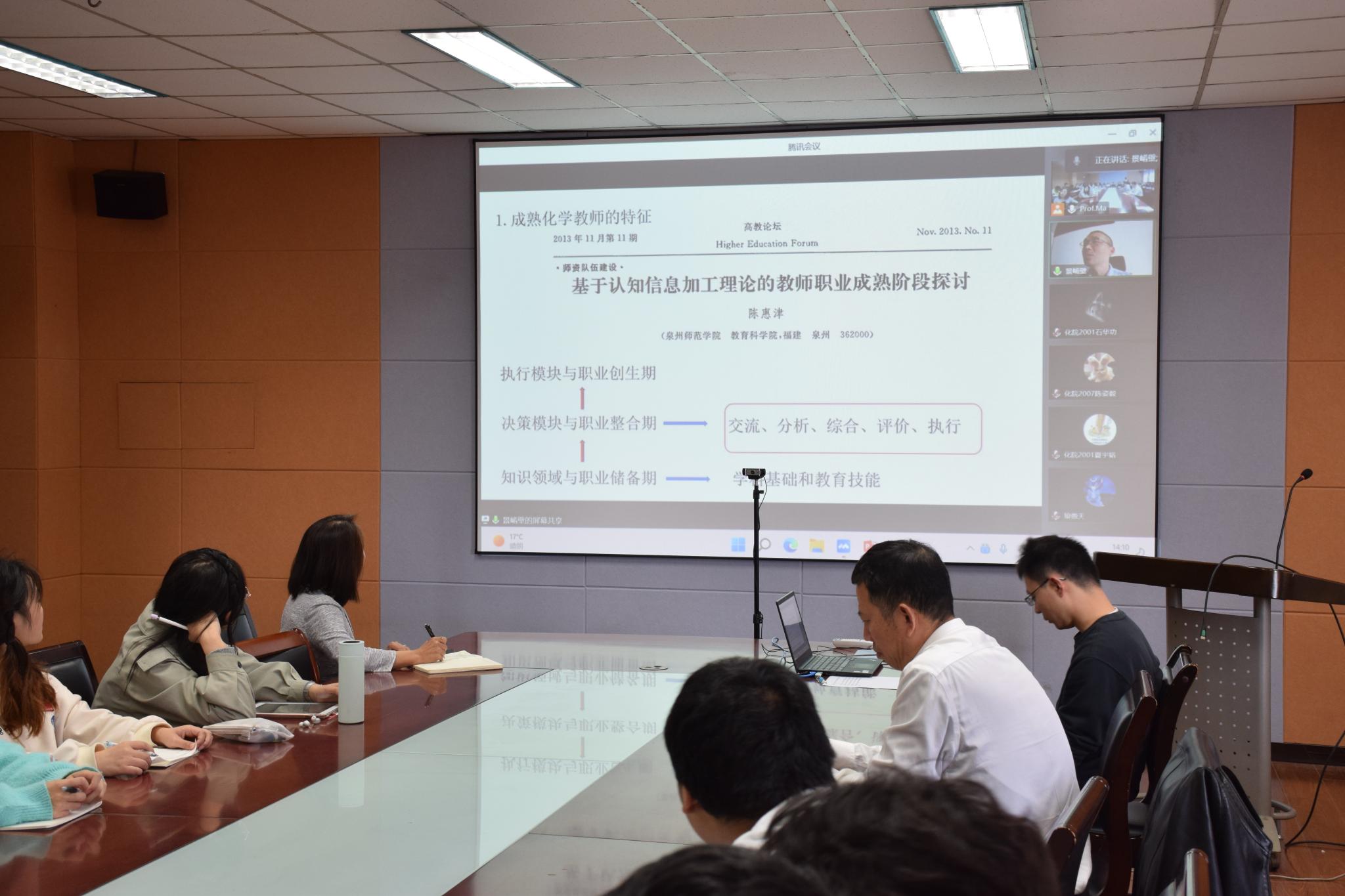 教师职业基本技能是师范生从事教师职业所必须具备的基本素质,良好的教师职业技能是高校师范生成功从事教师职业的敲门砖,也是其今后在教育事业上发展的加速器。为了进一步促进师范生职业技能的培养,助力师范生更好地投入到教育事业中,10月18日下午在化学楼219会议室,我院邀请扬州大学景崤壁副教授为2020级师范生带来了一场题为“成熟教师导向的化学师范生职前技能训练实践与思考”的云讲座。周守勇院长、马奎蓉主任、刘炳华教授、阚玉和主任、部分化学系骨干教师以及2020级全体师范生参加了此次讲座。讲座由马奎蓉主任主持,周守勇院长对景崤壁副教授进行了介绍并表示热烈欢迎。