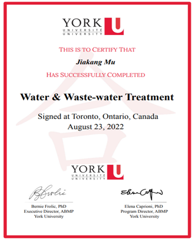为推动与加拿大一流大学的实质性合作,提升联盟内高校学生的国际竞争力和国际学术研究能力,河海大学于2022年7月-8月,与加拿大约克大学(York University)联合举办了 “水和废水处理”暑期课程培训,化院环境科学专业2004班学生穆家康获推荐参加该课程学习,顺利完成课程并且通过考核,获得了由约克大学颁发的项目证书及成绩单。