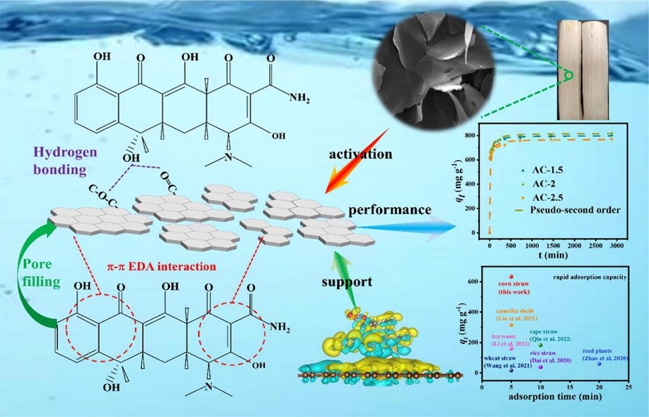 二维材料由于具有超高的比表面积,暴露更多活性位点而引起广泛的关注。该工作以玉米秸秆芯为原料,通过简单的碱浸润、煅烧方案制备出具有超高比表面积(2276.44 m2 g-1)的二维多孔活性炭纳米片。制备的多孔活性炭纳米片具有快速的四环素吸附能力(5min内为633 mg g-1,为大多数生物炭的3-20倍)和较高的平衡吸附能力(804.5 mg g-1);并且在较宽pH范围(3-10)内保持很好的吸附性能,几乎不受水中存在的离子干扰。机理分析和DFT理论计算证明,二维多孔活性炭纳米片的快速高效吸附性能主要依赖于π-π电子给体受体相互作用。此外,氢键和孔隙填充也对四环素的吸附起作用。本工作对农业废弃物生物基高性能吸附材料的开发具有重要的指导意义。