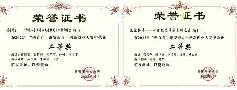 化院重视学生的创新创业,引导和鼓励学生积极参与科技创新,通过以赛代练提升学生创新创业水平,促进科教融合、产教融合。本次大赛,学院高度重视、精心组织,并得到了校团委的大力关心和支持,聘请校外专家进行指导,化院最终获得淮安市二等奖2项、江苏省二等奖2项和全国三等奖1项。