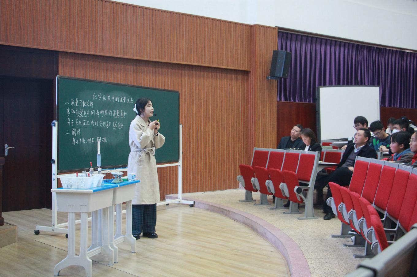 本次见习活动分为四个部分。首先,李梅生副院长代表学院向江苏省清浦中学刘海霞老师颁发校外指导教师聘书。然后,全体同学观摩了陶慧轩同学的公开课。陶慧轩同学以神探狄仁杰与元芳的问答视频为情境进行了课程导入,引出了本节课“化学反应中的质量关系”的主题,然后通过收集化学史信息和开展探究实验证明了猜想假设,并分别从宏观和微观角度分析了质量守恒定律的本质,最后通过思考练习帮助学生更好地掌握了本堂课的知识。授课结束后,陶慧轩同学为低年级师范生分享了本次课程教学设计的心得与体会。