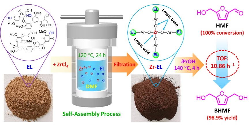 2,5-二羟甲基呋喃(BHMF)是一种新型的生物质基聚合材料单体,具备取代对苯二甲醇的潜力,能够广泛应用于合成聚酯类、聚醚类和冠醚类等高分子材料。MPV转移加氢策略是将生物质基平台化合物5-羟甲基糠醛(HMF)选择性转化为BHMF的有效途径,其中,设计开发高效低成本的催化剂是关键。研究团队针对不同氢供体的供氢能力和空间位阻,利用溶解热自组装法和牺牲模板法分别构筑了具有Zr4+-O2-酸碱对的木质素基双功能催化剂(Zr-EL)和具有Zr-N4配位结构的单原子催化剂(Zr/NC)。催化剂表征和实验结果表明:Zr-EL和Zr/NC均展现出了优异的催化活性和催化选择性,而且还具有良好的循环稳定性和底物普适性。相关研究成果为新型高效催化剂的再设计与改进和转移加氢体系的再完善与应用提供了重要参考。