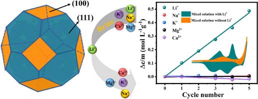 由于全球锂产品需求的爆炸式增长,从盐湖或海水中提取锂引起了全世界的关注。基于锰酸锂的电化学锂提取系统因其高提取容量和低能耗而成为商业应用的最强候选者之一。然而,有利于Li离子扩散的LiMn2O4表面取向恰好容易发生锰的溶解,这使得同时获得高锂提取容量和长寿命成为一个很大的挑战。该项工作通过设计一个截断的八面体LiMn2O4来解决这个问题,其中主要的(111)面抑制了Mn的溶解,而一小部分(100)面促进了Li的扩散。因此,构建的电化学锂回收系统在模拟卤水中具有较高的里提取容量。此外,每30次循环锰的溶解率仅为0.44%,30次循环后容量仍保持初始的85%。这些结果促进了LiMn2O4在电化学锂提取中的实际应用。