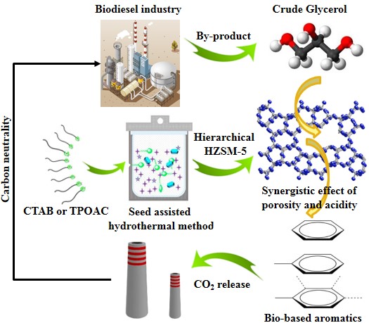 将废弃粗甘油直接芳构化为基础化工原料BTX芳烃是实现碳中和战略和循环经济的一种有效方法。研究团队分别以CTAB和TPOAC为软模板剂,通过晶种诱导结晶法构建不同孔道结构和酸性分布的多级孔HZSM-5分子筛,并研究该分子筛的结构对催化粗甘油芳构化产物路径及分布的影响。结果发现采用TPOAC作为介孔模板剂构建的多级HZSM-5样品具有更好的微介孔连通性和较高的传质效率,促进了甘油芳构化液相反应路径及烷基化反应的进行,具有较好的BTX收率及较长的使用寿命。