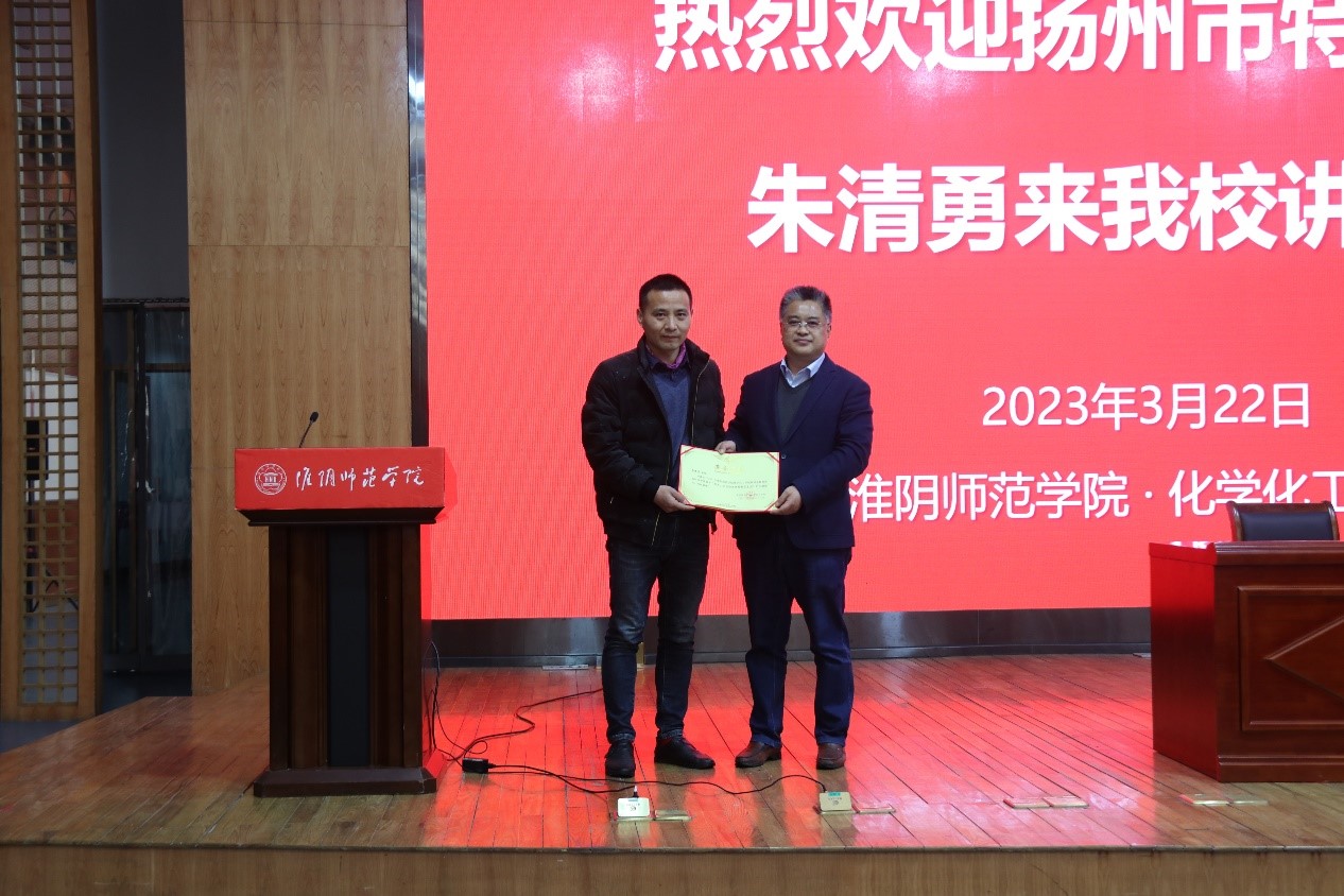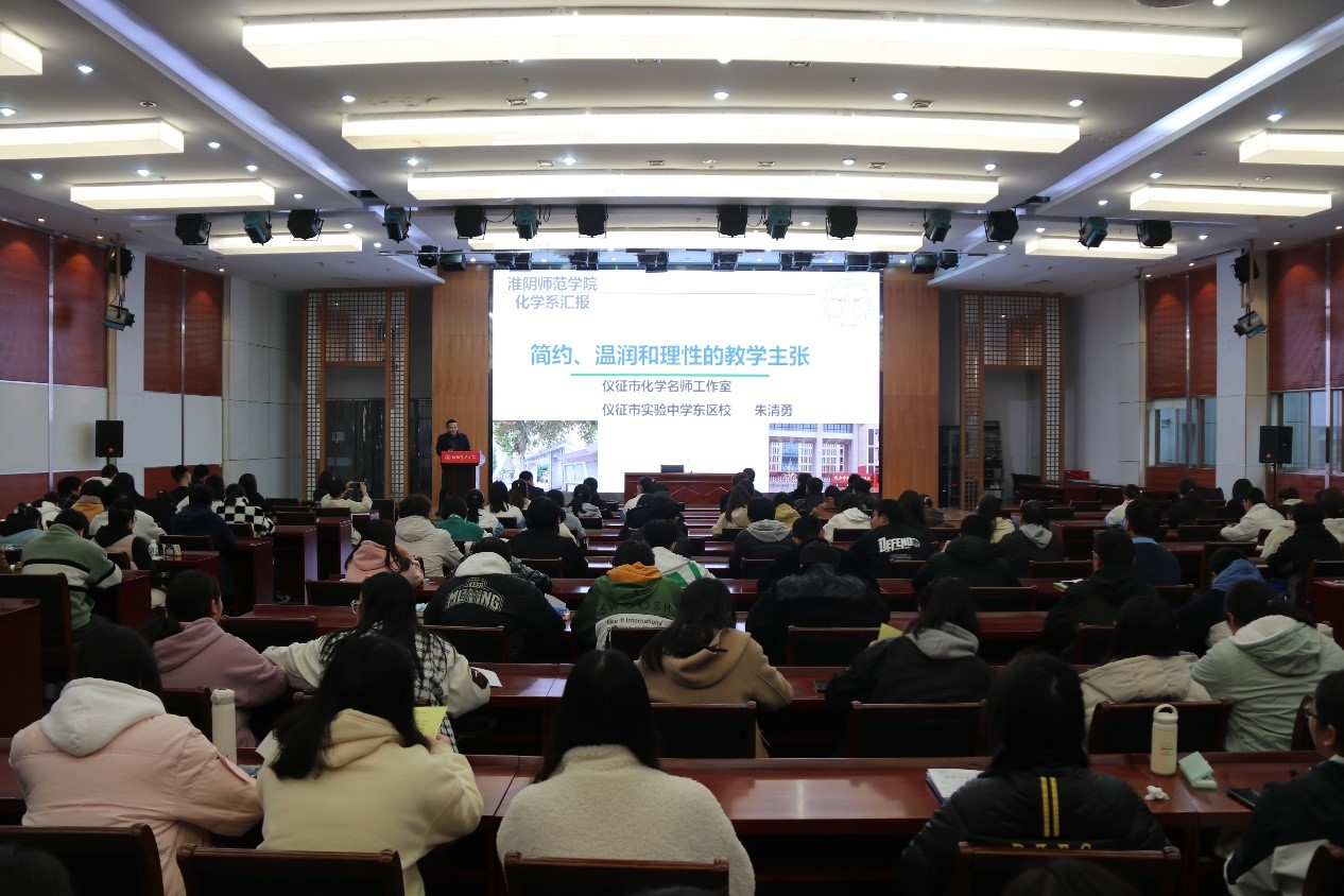 教学名师具有广博的知识、优秀的品格、丰富的阅历,对教学有着独到的见解,对教育充满了执着的热爱。教学名师的养成经历及其教育观点不仅能够对师范生的成长产生深远的影响,而且有助于师范人才培养目标的达成。为发挥一线基础教育教学名师在师范生培养中的示范作用,3月22日下午,扬州市特级教师朱清勇应邀在图书馆多功能报告厅,带来了一场题为“简约、温润和理性的教学主张”的主题讲座。讲座由周守勇院长主持,化学系全体师生参加了此次讲座。