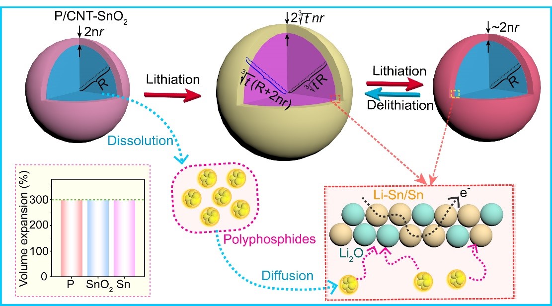 该项工作综合考虑多种电化学活性材料在循环过程中体积变化,利用SnO2与磷在完全嵌锂时具有几乎相同的体积膨胀率(300%),且经过首次嵌锂过程SnO2不可逆地转化为Sn与Li2O,生成的金属Sn在随后循环过程中与磷负极发生同步均向体积变化,可避免由于不同步的体积变化导致界面接触不稳定而引起表层材料脱落问题,同时过程产物Sn/Li-Sn合金可改善电极材料的电子导电性,加快多磷化物及磷化物转化动力学。生成的Li2O不参与电化学反应且对多磷化物具有强化学吸附作用,抑制了多磷化物在电解液中跨膜扩散。因此,P/CNT-SnO2表现出良好的循环稳定性与高倍率性能,在100 mA/g下的循环100次,放电比容量达1189.2 mAh/g,当电流从100 mA/g升高至1000 mA/g,仍能保持78.5%的容量。