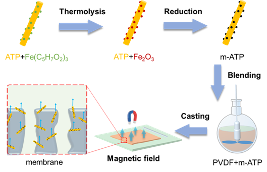 本团队将地区凹凸棒石(ATP)矿物资源与膜技术相结合,已成功开发了面向PVDF改性的ATP基添加剂。然而,在PVDF膜制备过程中,改性剂大部分存在于膜基质中,使得最易与污染物接触的膜表面改性效果欠佳。如何提高添加剂对膜表面的改性效果成为了亟待解决的难题。针对这一问题,本文将磁性纳米颗粒负载至ATP表面合成了磁性凹凸棒石(mATP),在膜制备过程中通过磁场的作用使mATP迁移至膜表面,从而极大提高了膜的抗污染能力及易清洗能力。