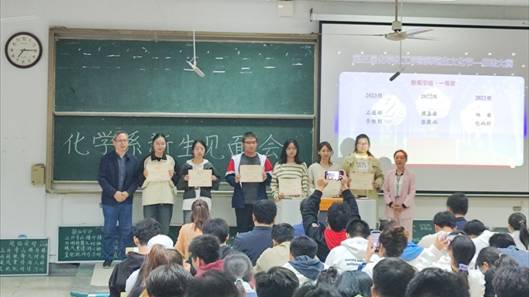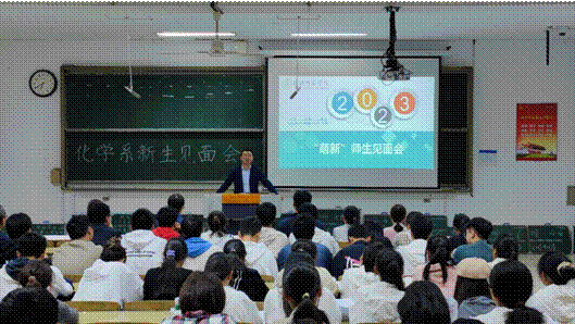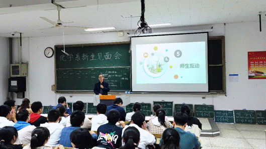 李梅生院长从专业发展沿革、专业建设成效、师资力量、学生发展等角度对化学系进行了介绍,用名人实例强调化学学科的重要作用,并结合学校、学院、专业的办学历史和办学成效,鼓励同学们要树立起学科自信、专业自信和个人自信。