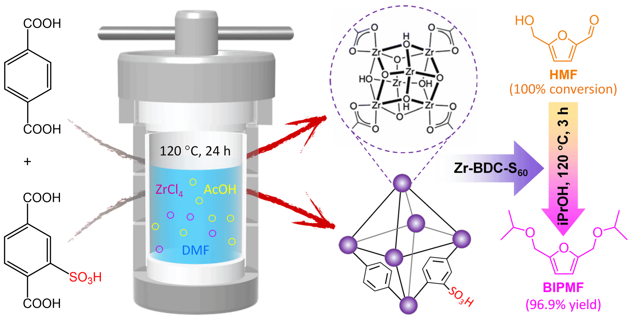 2,5-二(异丙氧基甲基)呋喃(BIPMF)是一种高品位的生物质基呋喃双醚液体燃料,具有与商用柴油类似的闪点、流动性和润滑性,可以完全满足柴油发动机的运行要求,引起了人们广泛的关注。本研究以四氯化锆为金属离子供体,以BDC和BDC-SO3H为双有机配体,借助简单的溶剂热自组装方法,制备得到了一种同时含有Lewis酸碱位点和Brønsted酸性位点的双功能催化剂(Zr-BDC-S60)。通过调节双有机配体比例,可以优化不同活性位点之间的协同作用,进而可以控制HMF一锅还原醚化的反应路径,实现BIPMF的高效合成。在异丙醇中,120 °C仅需反应3 h,BIPMF的得率即可高达96.9%,展现出了较大的应用潜力。
