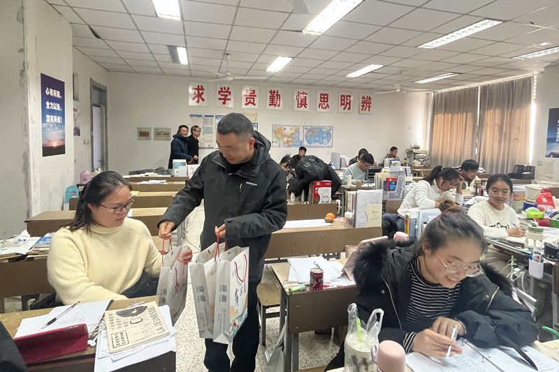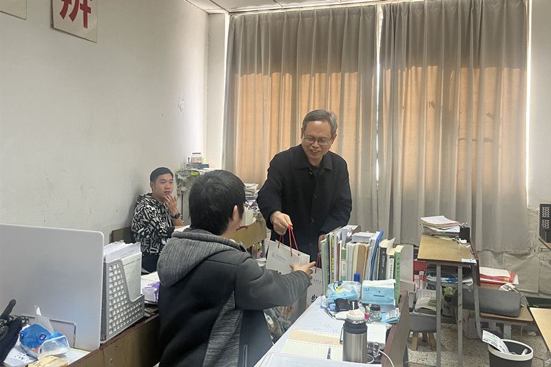 11月24日上午,学院党委书记骆仁林和院长李梅生到化学楼考研教室看望慰问考研学生,将学校发放的考研“冲刺包”发放给同学。
