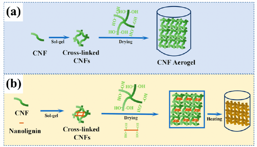木质素作为一种刚性的复杂高分子,与纤维素复合不仅可以提高材料的力学强度,其丰富的官能团和自身复杂的三维网络结构也能赋予纤维材料一定的防水及紫外屏蔽等性能。在纤维素复合气凝胶材料制备的过程中,木质素及其聚集态等对其性能都有显著的影响。对木质素的尺寸、形态、掺杂量等进行调控,可以控制木质素/CNF复合气凝胶材料性能。本研究设计了一种外源木质素定量掺杂制备CNF复合气凝胶材料,利用机械研磨法对外源木质素进行预处理得到木质素纳米粒子并加入到CNF气凝胶材料当中,耦合液氮冷冻干燥和真空烘箱干燥。其中木质素质量分数13.5%的CNF复合气凝胶相比于不添加木质素的材料的抗拉强度提升了340%,显著提高了气凝胶材料的机械性能。外源木质素对生物质薄膜的力学增强可以归为以下3点:首先,木质素含有刚性的苯环结构,可以作为增强填料提高气凝胶材料的力学性能;其次,木质素以溶液或纳米粒子这种更均一的形态与CNF复合成气凝胶,能够有效提高材料的力学强度;最后,木质素具有热塑性,在真空烘干处理阶段,软化的外源木质素作为材料内部与纤维素的界面交联剂,有效提高了木质素与纤维素之间的结合面积,最终提高了气凝胶材料的力学性能。木质素同时还含有疏水性的非极性官能团,其自身的苯丙烷交联网络和复杂的化学结构又赋予木质素一定的疏水性。因此,复合含有木质素的CNF气凝胶材料具有更明显的防水性能。利用木质素的热塑性,使木质素在纤维间软化进一步提升纤维的交联密度,达到防水的目的。综上所述,本研究既为木质素组分的利用提供新视角,也不违纤维素气凝胶作为吸附材料的天然绿色属性。