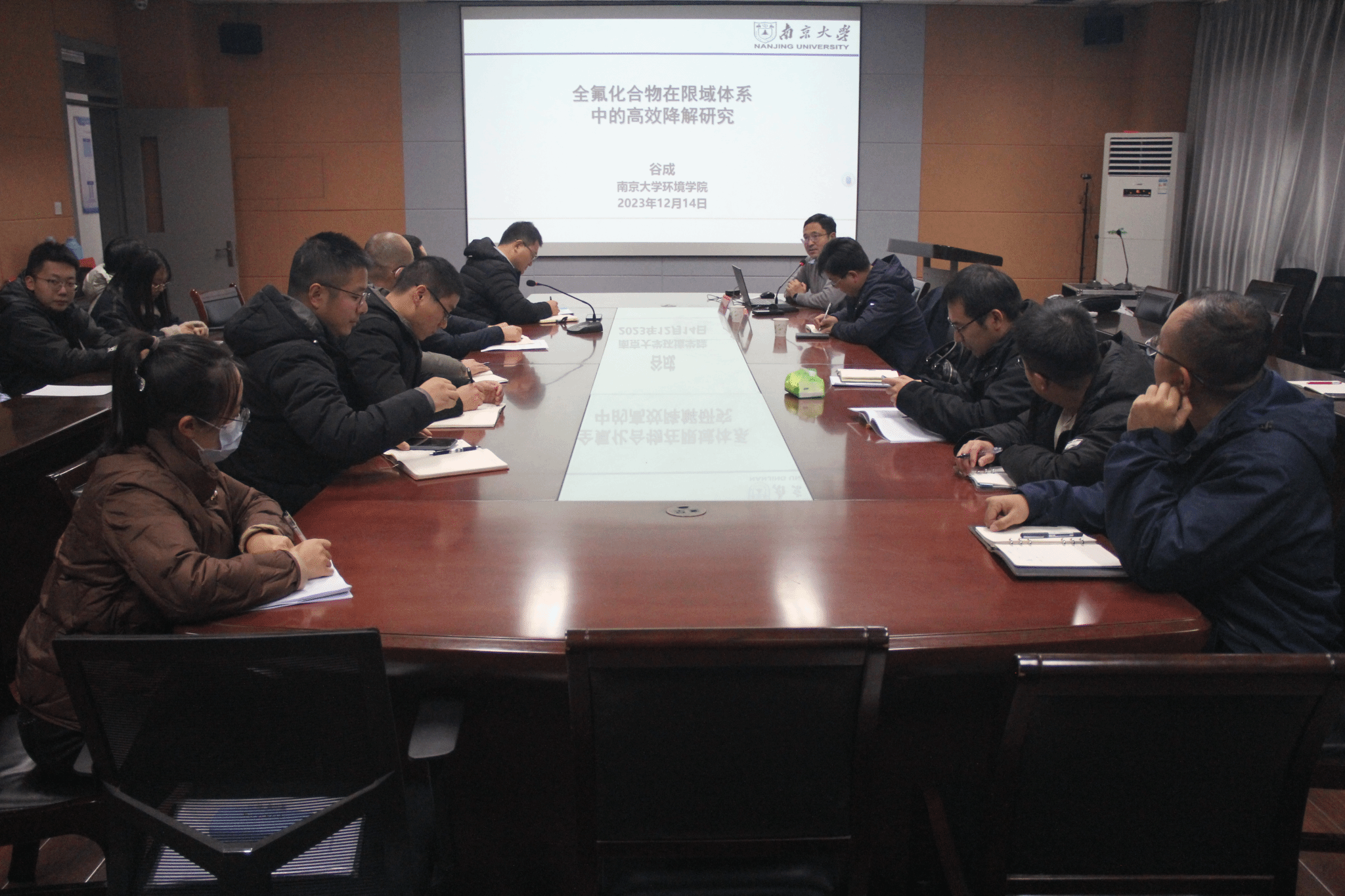 谷成教授首先结合当前国家及地方关于新污染治理的相关政策与要求,详细介绍了新污染物的种类、特征及其治理技术研究的重要性与迫切性。随后,谷成教授以典型的全氟化合物为例,从治理材料选择、限域体系构建、水合电子特性、降解效率及机制等方面全面分享了课题组近期在全氟化合物高效治理方面的系列研究成果。报告结束后,与会师生就材料特性、脱氟效率等相关问题与谷教授进行了热烈、深入的交流。