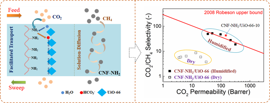 气体分离膜技术是利用各种气体分子在膜材料中渗透速率的差异来实现分离,是一种新兴的“绿色技术”。但渗透率和选择性之间的权衡限制了其分离性能。基于此,淮阴师范学院赵宜江教授(通讯作者)及贾明民博士(第一作者)等人提出以水凝胶材料纳米纤维素(CNFs)作为聚合物基质,通过氨基化改性,并复合UiO-66,制备UiO-66/CNF-NH2复合膜,并测试了复合膜在干湿状态下的CO2分离性能。加湿进料气体状态下,基于CNFs复合膜吸附水分子,表现为凝胶态,复合膜内水分子可以充当CO2的移动载体,而填充的UiO-66充当扩散的快速通道,CO2/CH4气体分离性能得到明显增强(CO2通量257.0 Barrer,CO2/CH4理想选择性71.3.),超越了2008 Robeson 上限,并长时间测试条件下展现出较高的稳定性。这项研究为开发用于高分离性能气体分离膜材料提供了新的思路。
